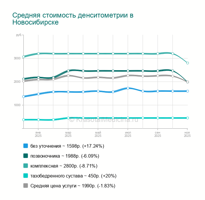Денситометрия – метод рентгенологического исследования, направленный на определение минеральной плотности костной ткани. Денситометрия проводится с целью оценки риска развития остеопороза и эффективности терапии, замедляющей деминерализацию костных тканей. Всего в Новосибирске найдено 12 клиник, где можно сделать денситометрию костей.